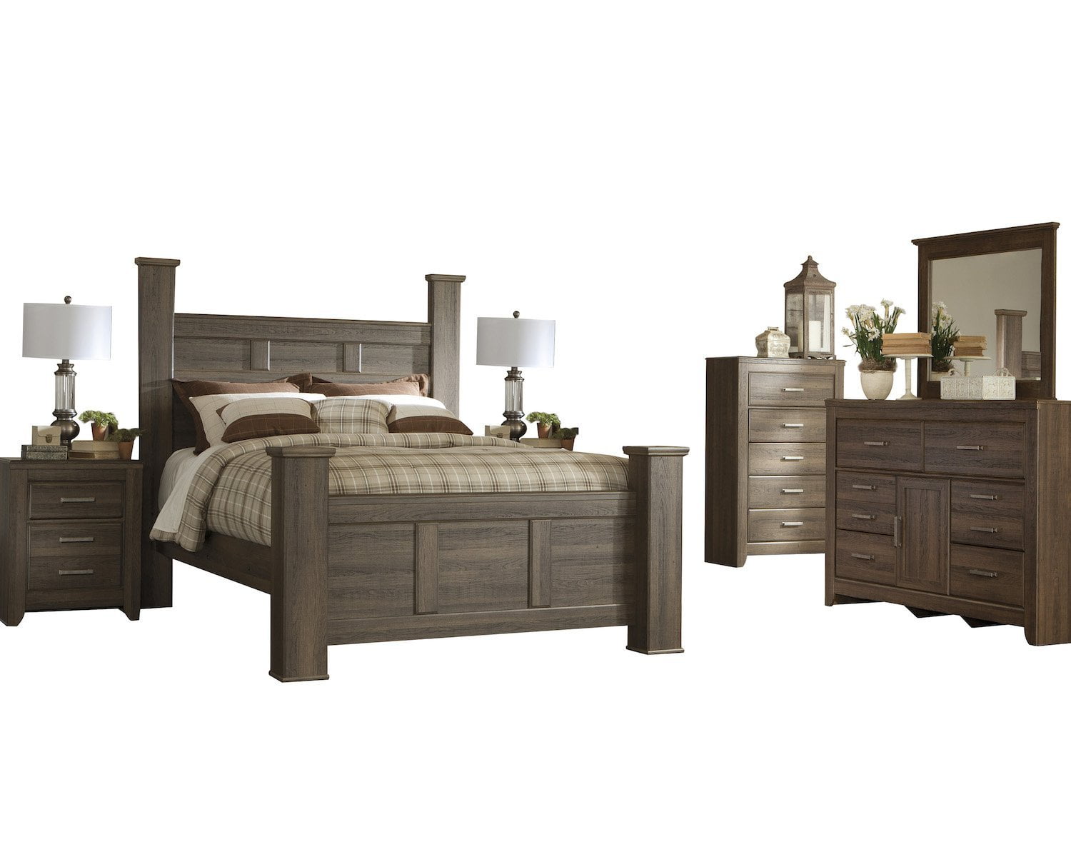 Ashley Juararo King Bedroom Set / Juararo queen set includes dresser, mirror, chest, bed, and 1 nightstand.. Queen bed, dresser, mirror and 1 night stand. Features tall headboard with paneling and a large mirror topping the dresser with 6 drawers and center cabinet w. Juararo queen set includes dresser, mirror, chest, bed, and 1 nightstand. Consigue el aspecto de la elegante madera de granero sin poner un pie en un patio de salvamento.el roble de la cama con dosel juararo king tiene un acabado vintage que recuerda a una reliquia familiar desgastada por el tiempo.cálido, rústico y naturalmente hermoso, tiene ese atractivo eterno.dos. Bed, bedroom furniture, twin size bed, full size bed, queen size bed, king size bed, california king size furniture, bed frame, furnishing for bedroom, bedroom furniture set.